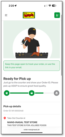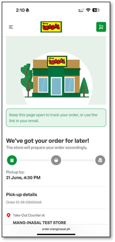 Order Tracker (Pick Up Later) Confirming Order Preparing your food Ready for Pick Up Order is already picked up Related articles Order Tracker (Pick Up Now) How Can I Follow Up or File a Complaint About a Mang Inasal Store?